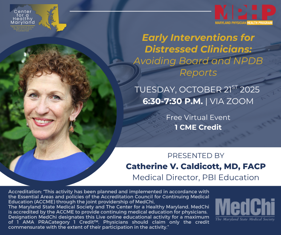 This event is provided FREE of charge. Your DONATION helps us defer costs and supports the mission of the Maryland Physician Health Program